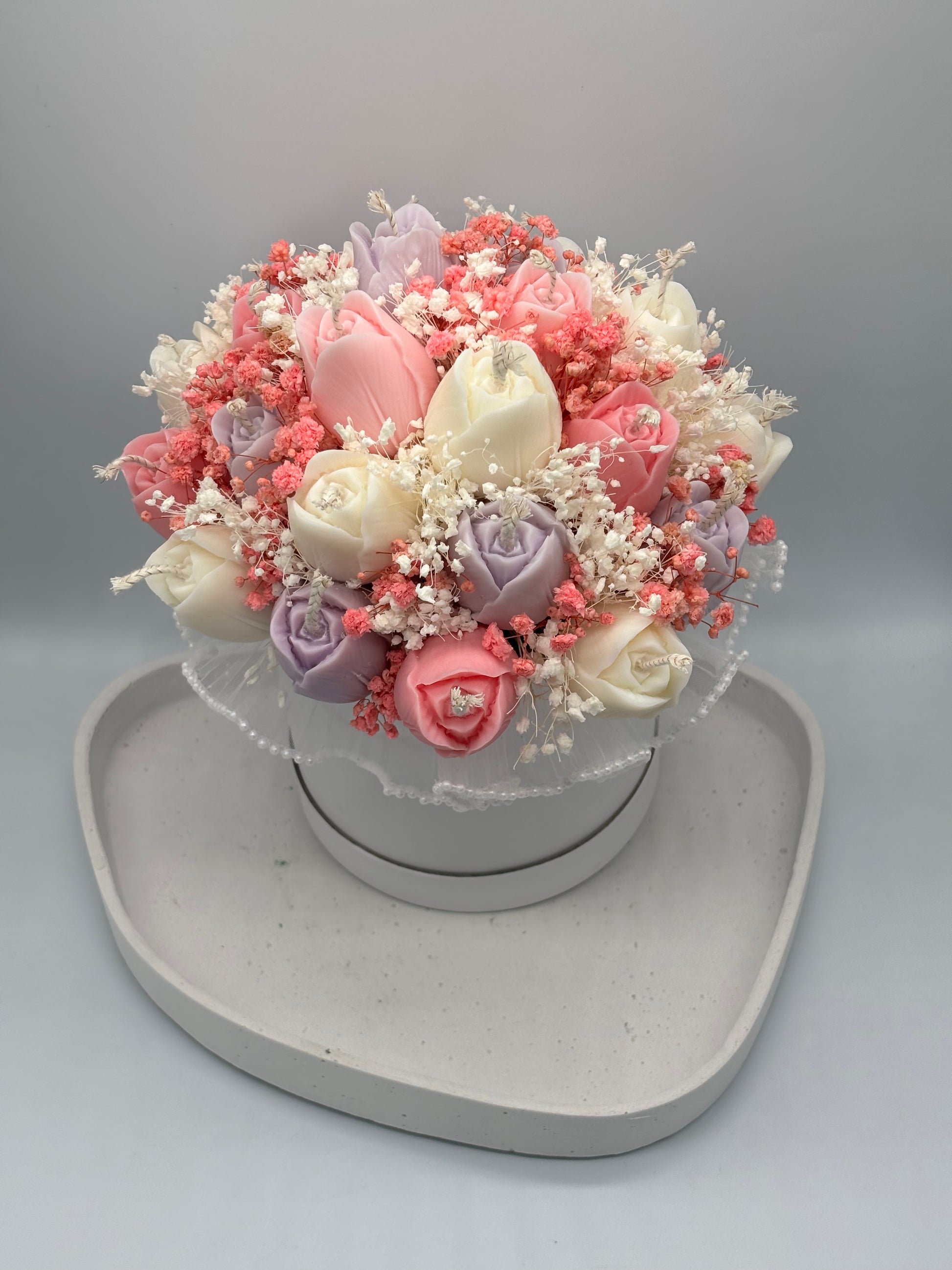 Im Gegensatz zu echten Blumen verwelkt dieser Strauß nicht – er bleibt als Erinnerung bestehen und kann gleichzeitig als Kerze verwendet werden.