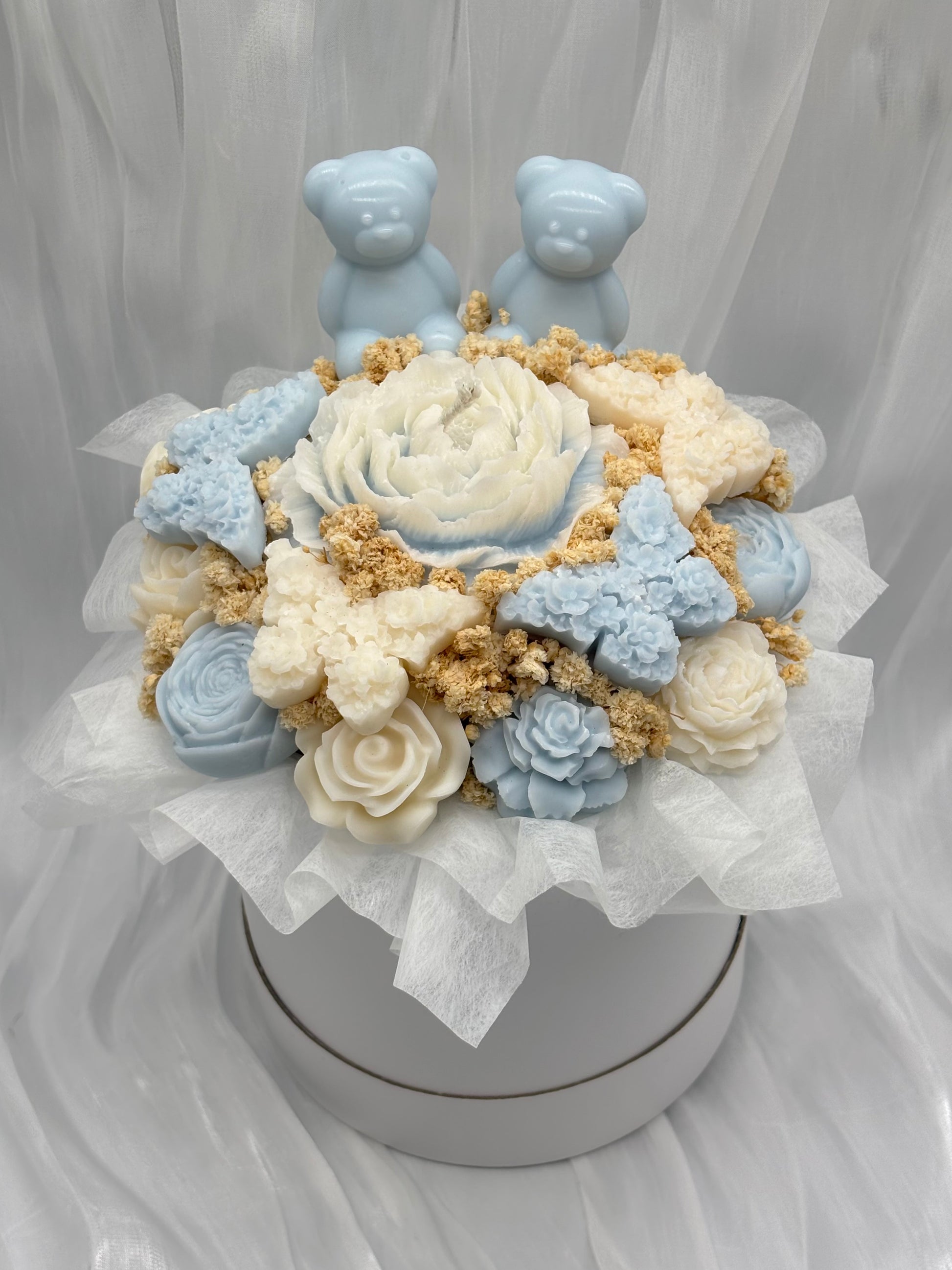 Mit seinen zarten Farben und dem verspielten Design ist dieser "Teddy"-Strauß die perfekte Geschenkidee zur Geburt, Taufe oder Babyparty. Ideal als Dekoration oder besonderes Geschenk für frischgebackene Eltern.