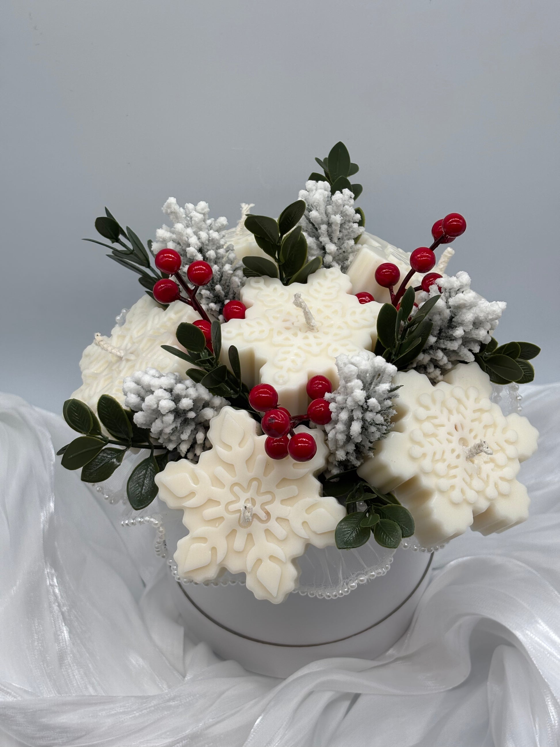 Ein elegantes Winterbouquet aus handgegossenen Schneeflocken-Kerzen – edel, festlich und mit Liebe arrangiert. Perfekt als Geschenk oder für die eigene Winterdeko. 🤍